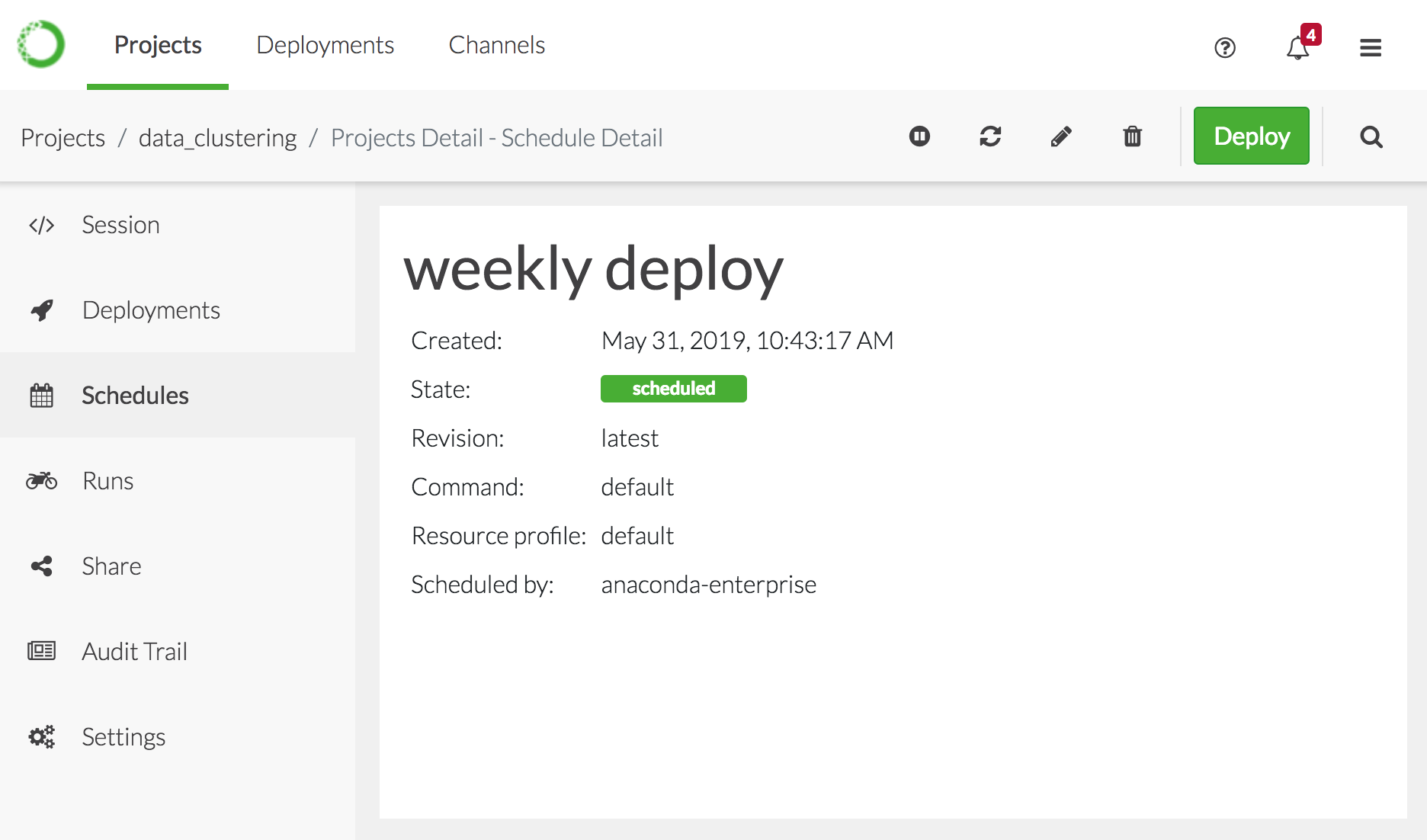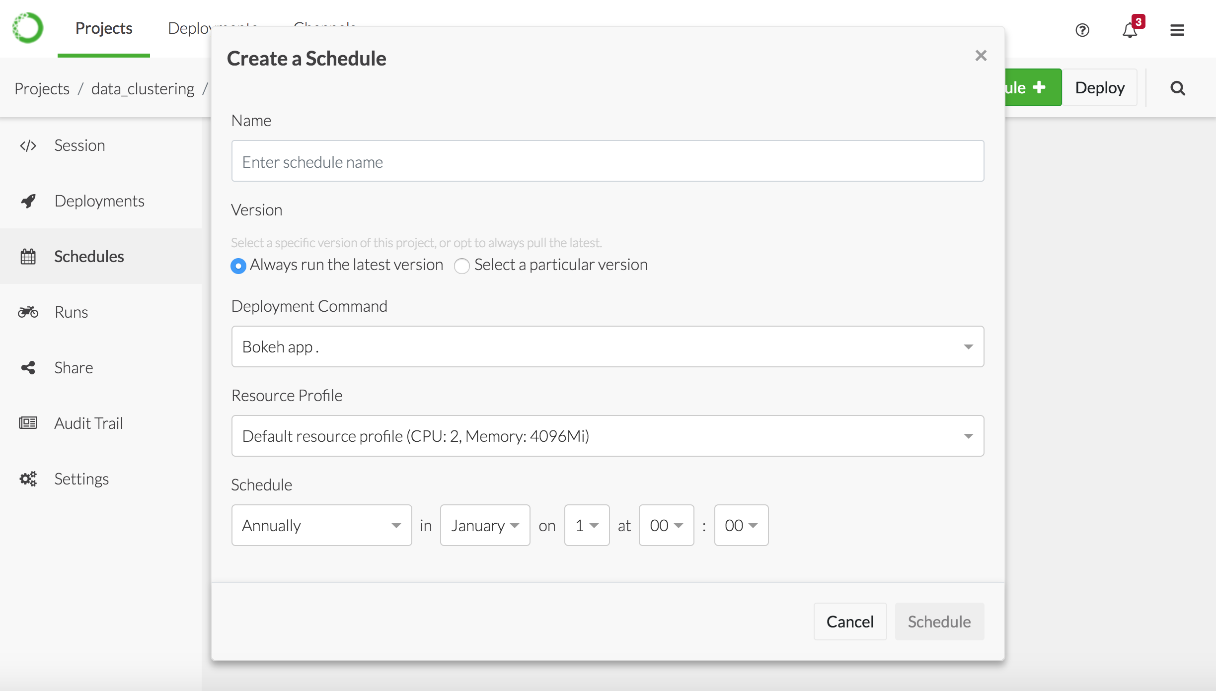 - Open the project you want to schedule a deployment for by clicking on it in the Projects list.