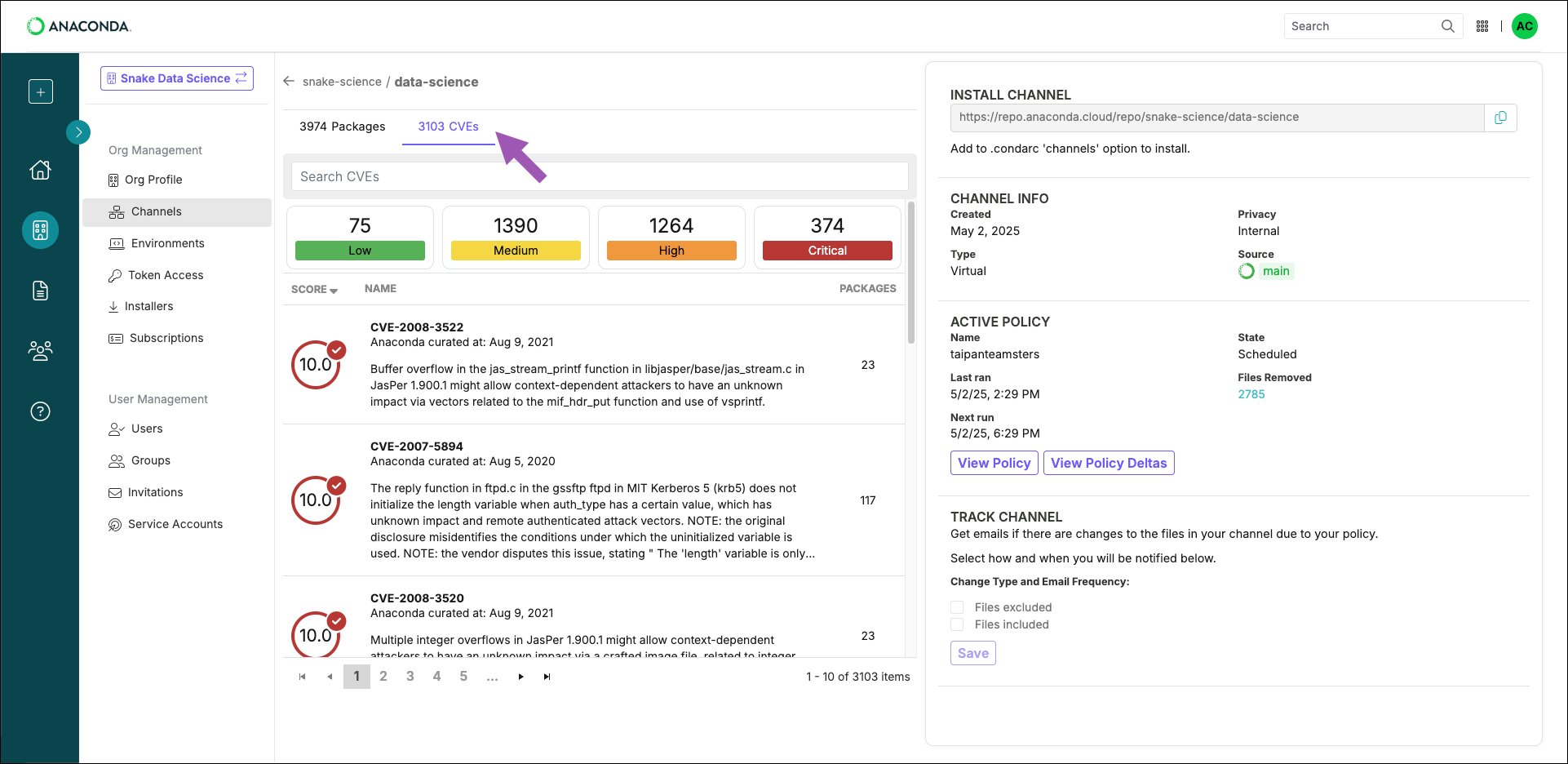 CVEs are weaknesses in software that can be exploited to access sensitive information, such as credit card numbers or social security numbers. Because modern software is complex with its many layers, interdependencies, data inputs, and libraries, vulnerabilities tend to emerge over time. Knowing when and how the code you use is vulnerable to attacks is a powerful tool in allowing you to mitigate the potential for harm, and Anaconda provides you with everything you need to keep your pipeline secure. To learn more about CVEs and how Anaconda mitigates and manages them, watch the State of Data Science webinar.Why trust Anaconda?