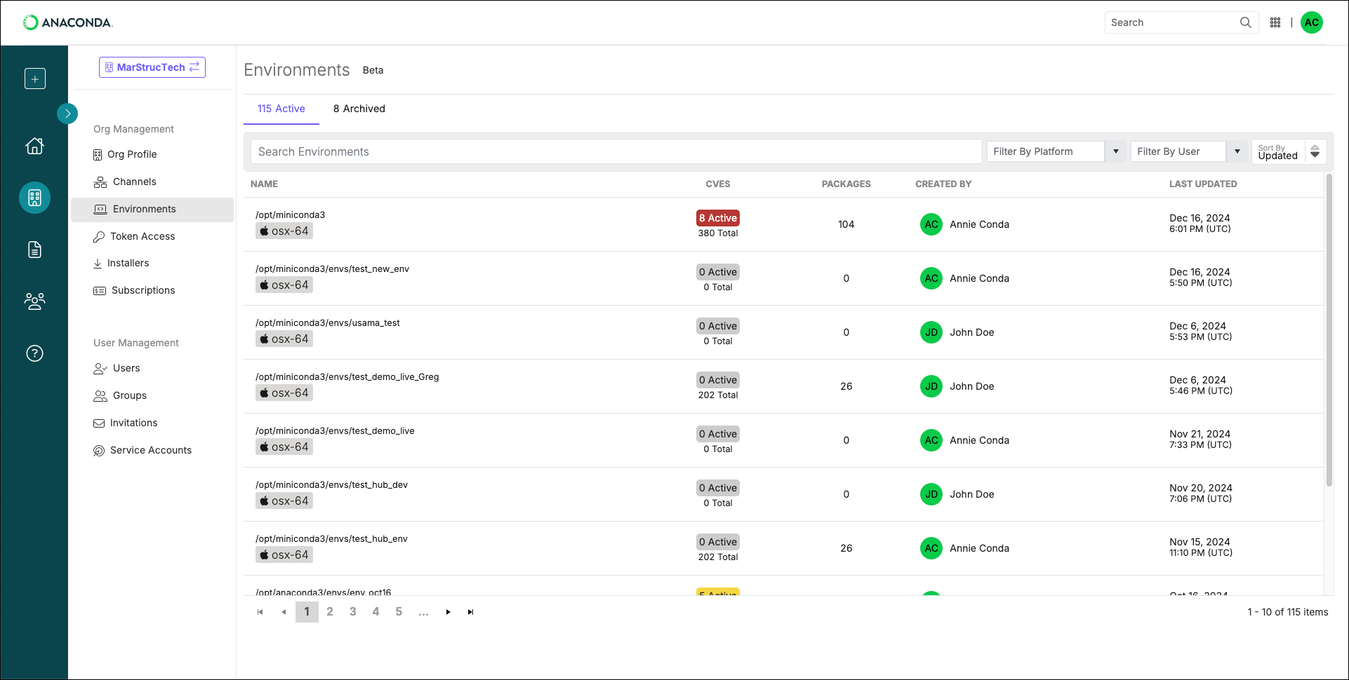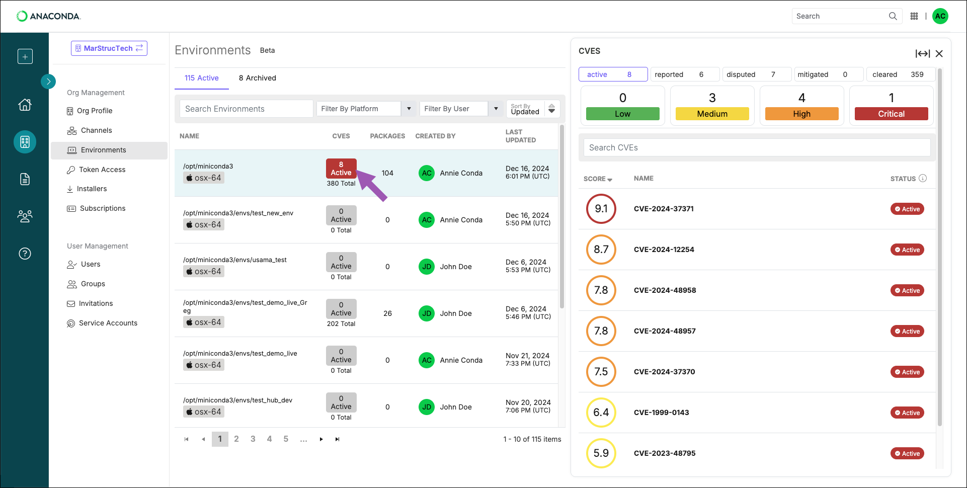 Scanning an environment checks the most recently saved conda environment log for CVEs associated with the packages it contains.Environments are automatically scanned when created, but not when they are logged or when the log updates. To ensure an accurate assessment of an environment’s current CVE state, perform a scan before you explore it in Anaconda.com. You can also scan environments locally to identify potential issues immediately.