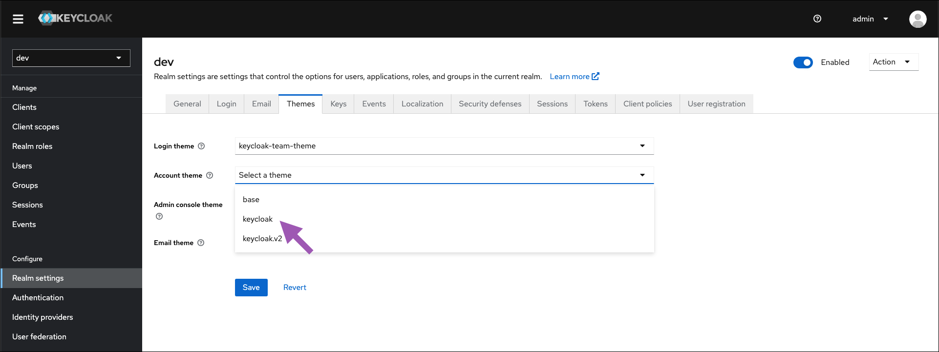 - Open the Account theme dropdown menu and select keycloak from the list.