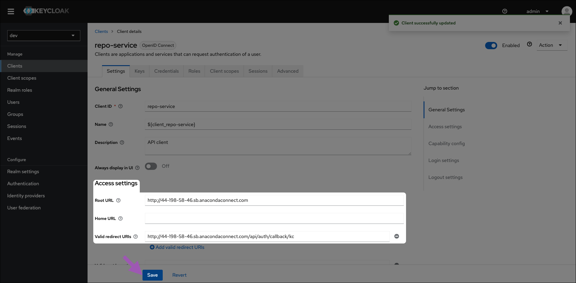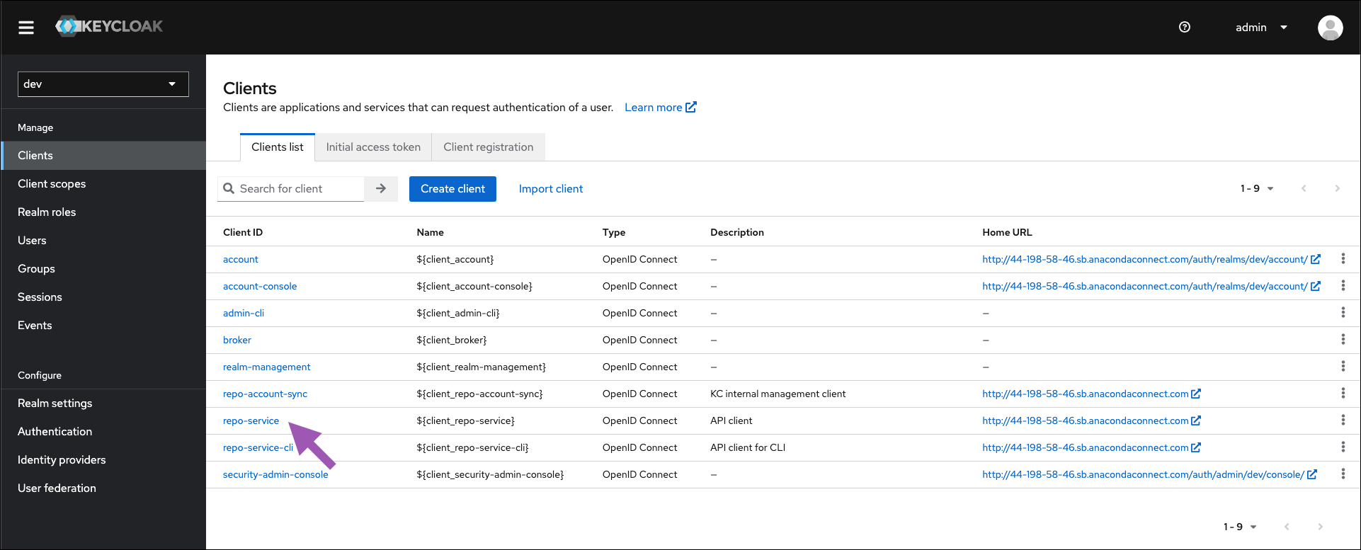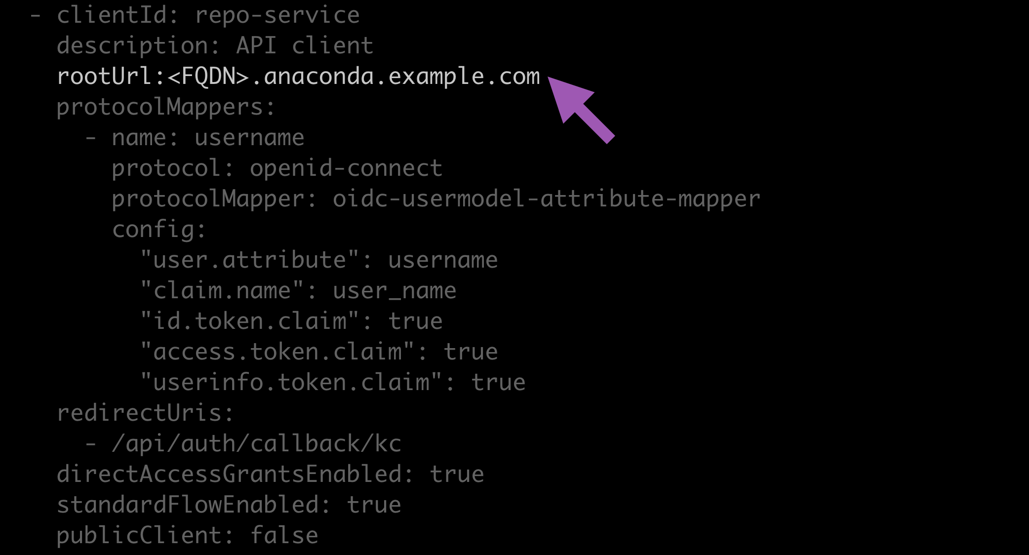clientId: repo-servicesection of the file and add the following line:Example kc.yaml file