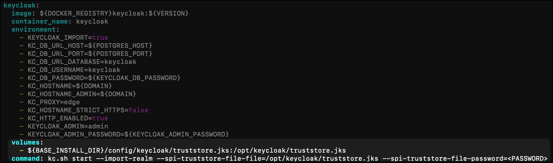 services: keycloak:section of the file and add the following lines:Here is an example of what yourPay close attention to the indentation of your added lines. If you do not add them at the correct level of indentation, your configurations will not be readable.docker-compose.ymlfile should look like when you are finished adding these lines: