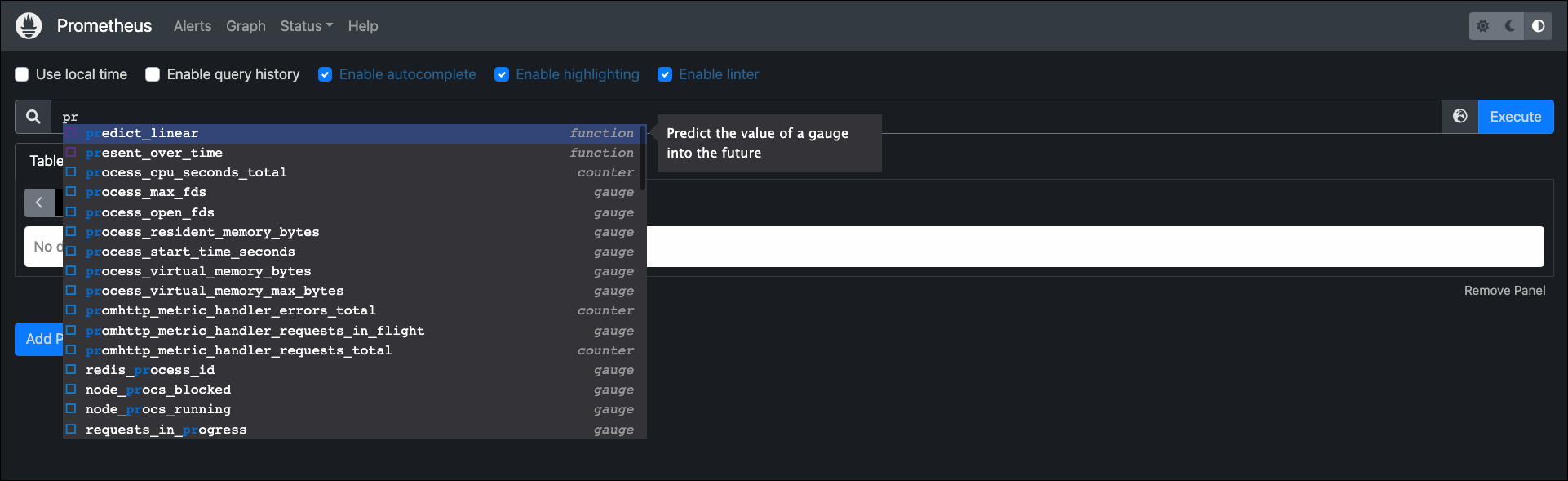 Prometheus uses a built-in expression browser for time series visualizations of system metrics. To create system metric graphs in Prometheus:- Enter the name of an expression you want to view in the search box.
