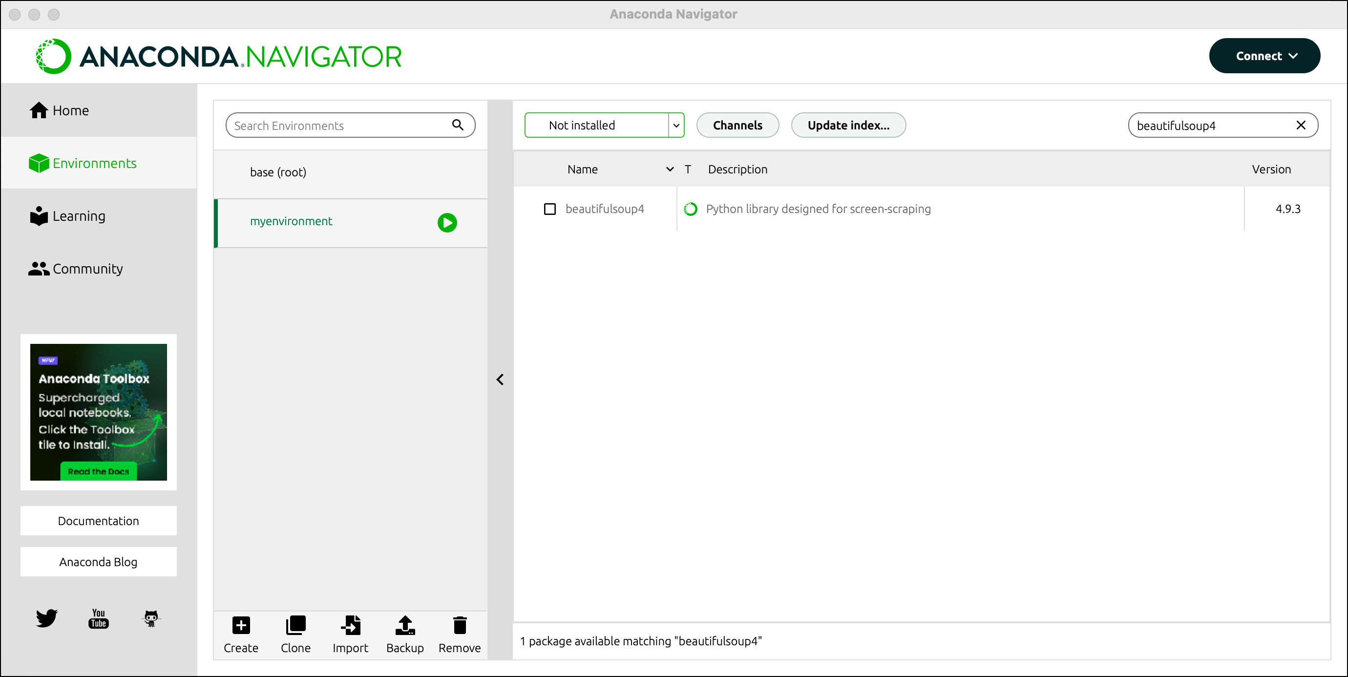 beautifulsoup4 package is now displayed in the list of installed programs in the current environment.