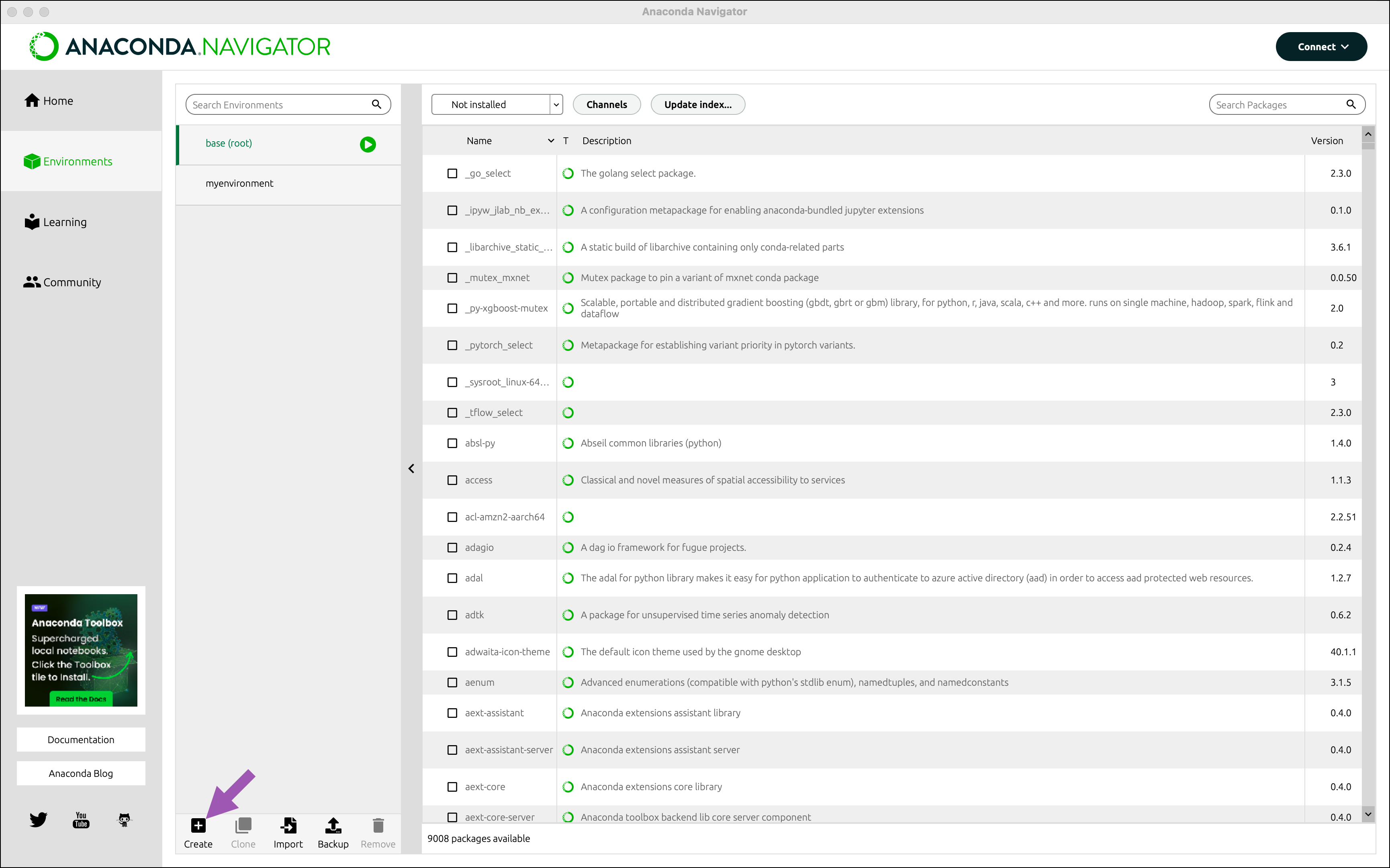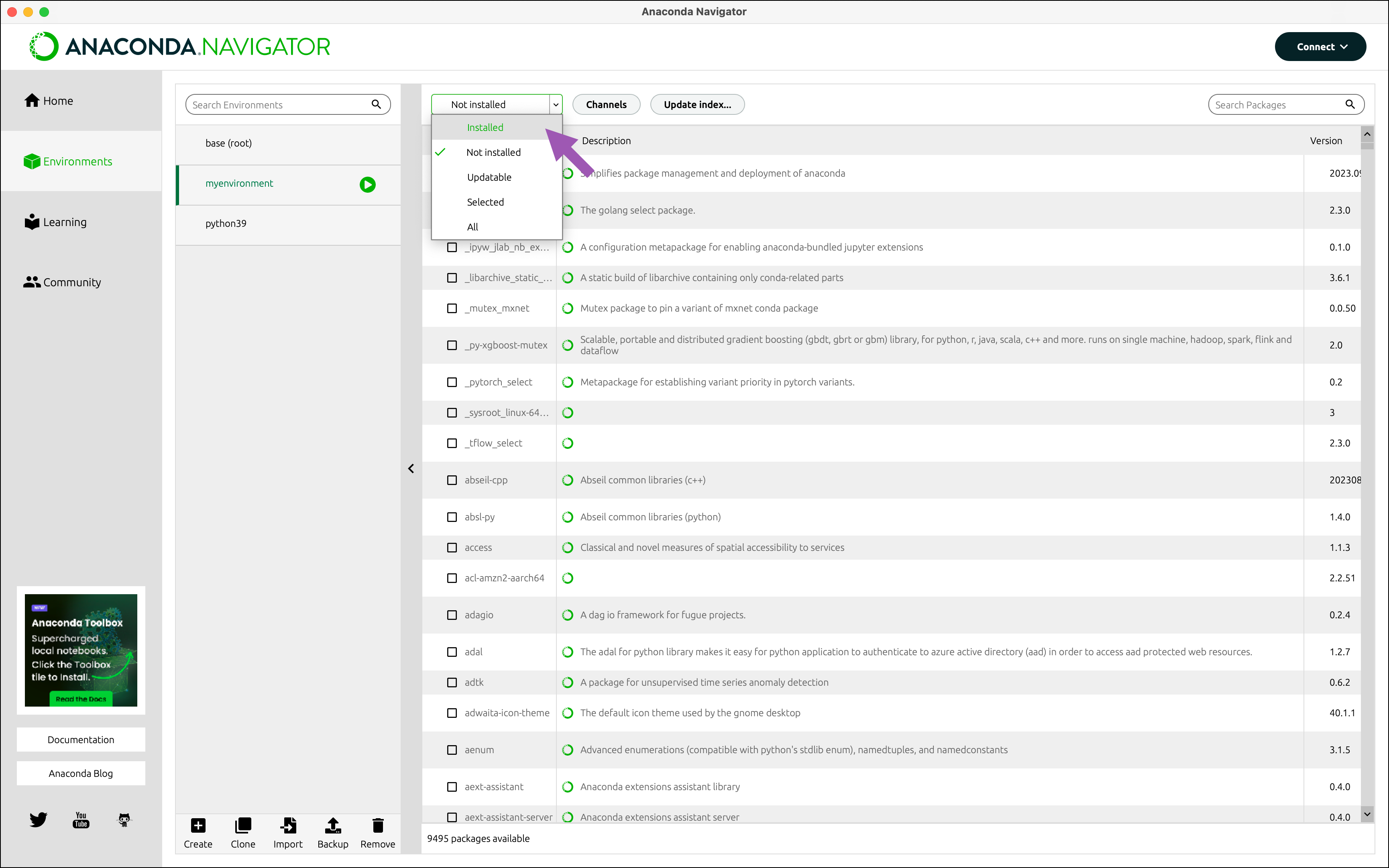myenvironmentfrom the environment list to activate it. - Open the package filter dropdown and select Not installed to view a list of packages that are available to install from the you are connected to.