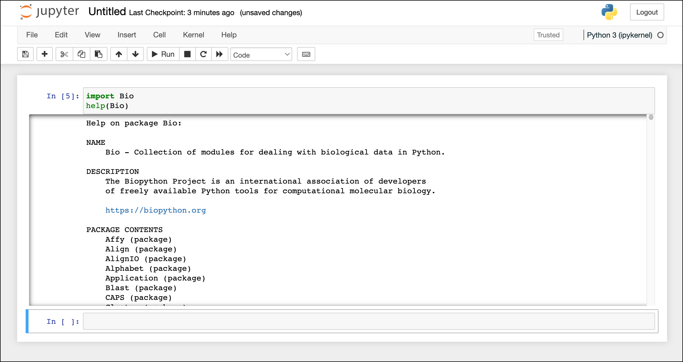 Once a package is installed, it appears in the Installed package list for the given environment, but another way to confirm that a package is installed correctly is by opening a Jupyter Notebook in that environment, importing the package, and displaying its help text. These instructions assume you created an environment namedbiopython and installed the BioPython package into it.