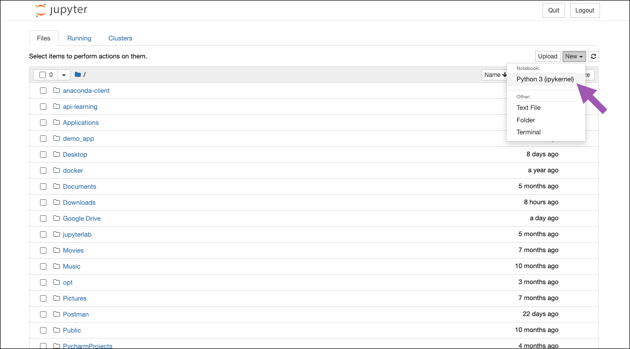 In the Jupyter Notebook, click New and select the Python 3 kernel.