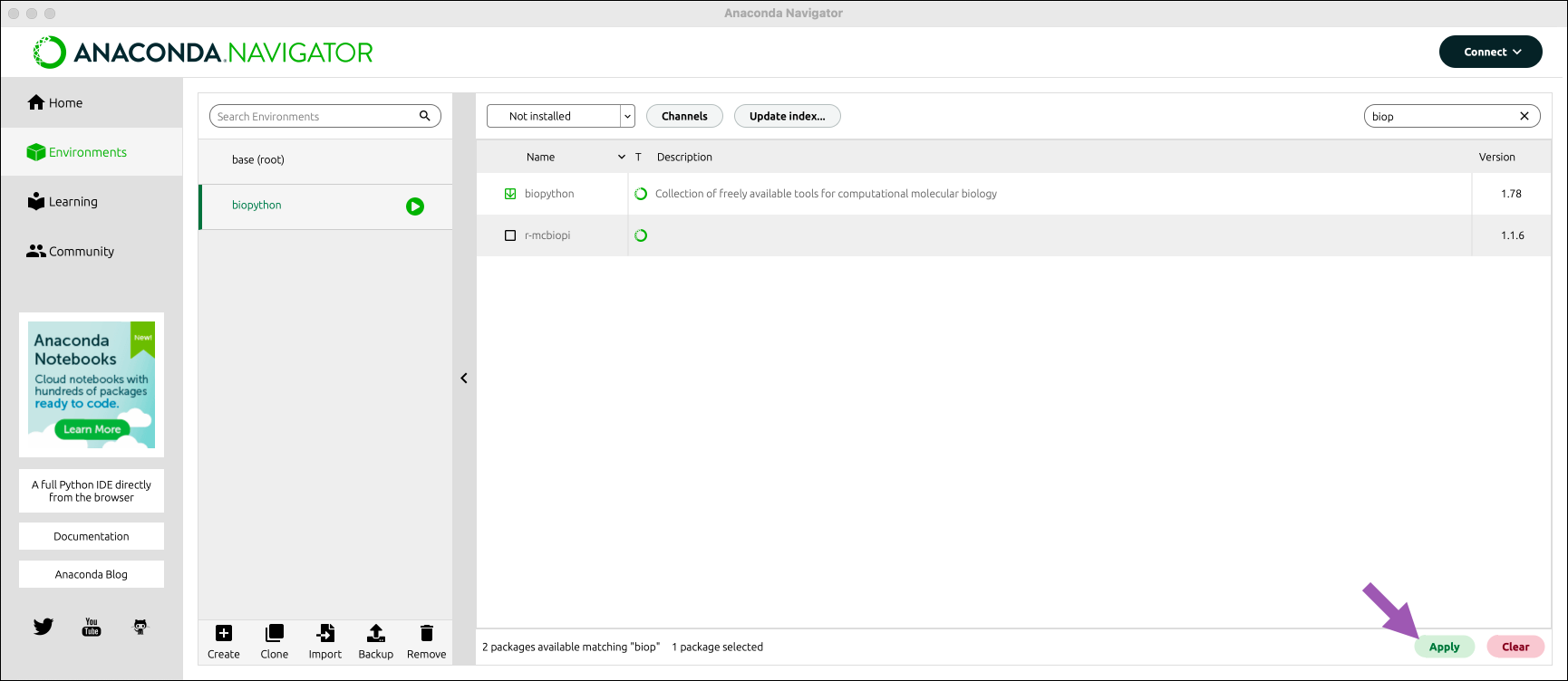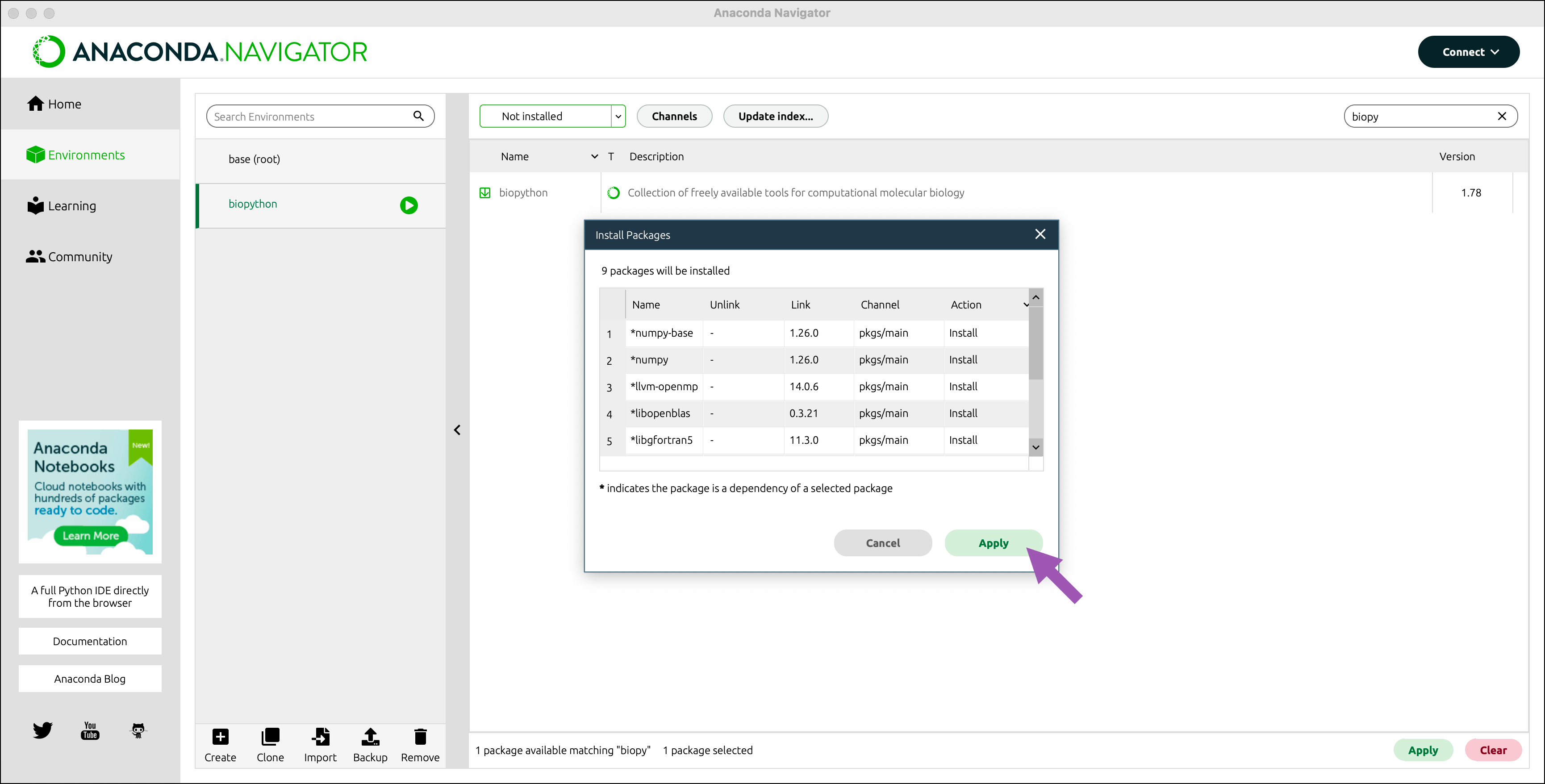 biopythonenvironment from the environment dropdown. -