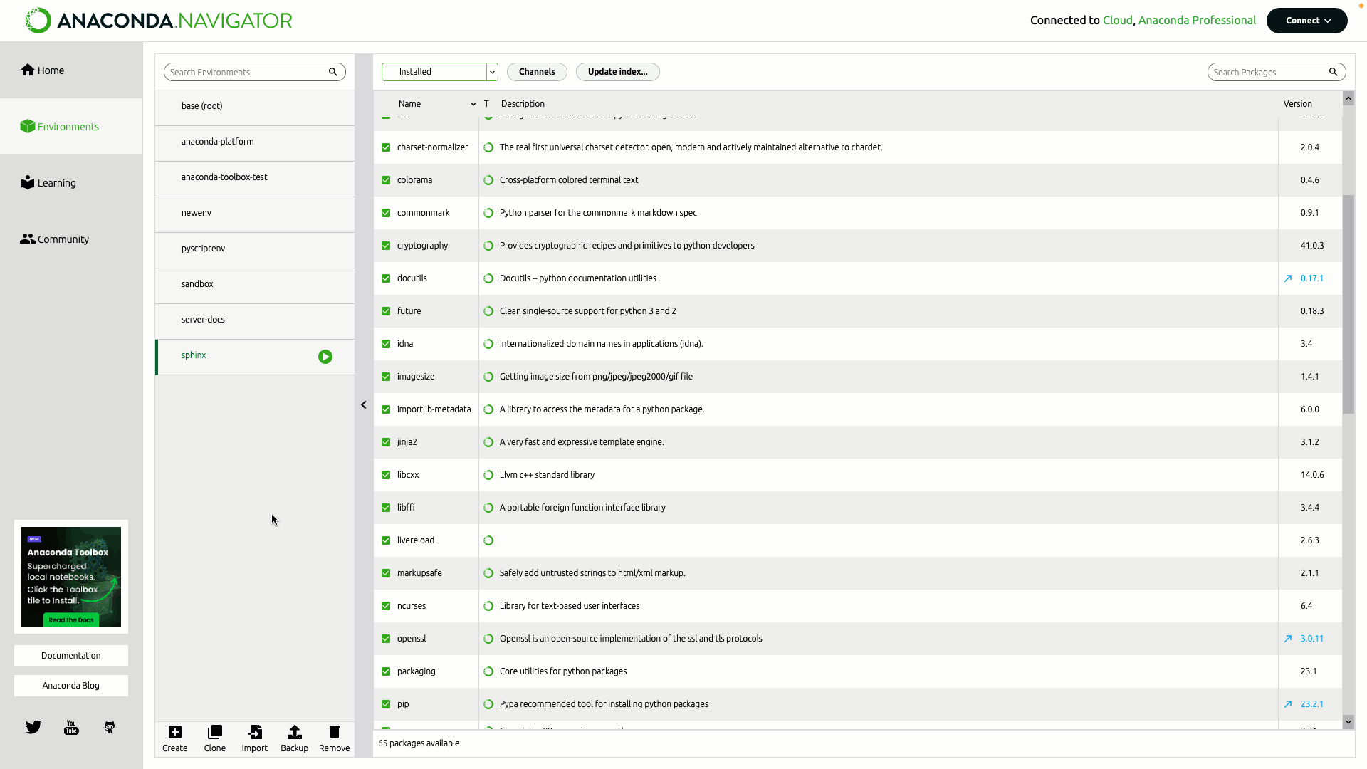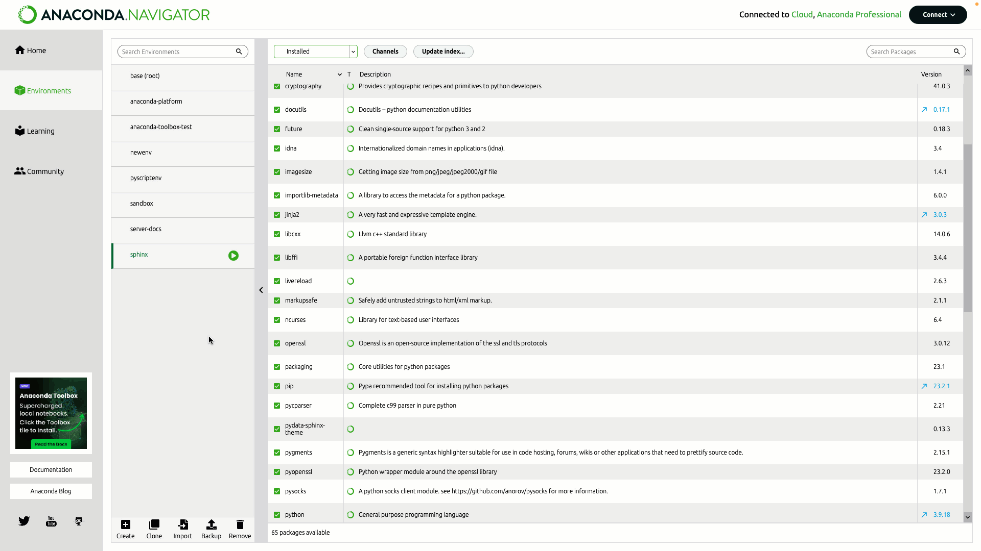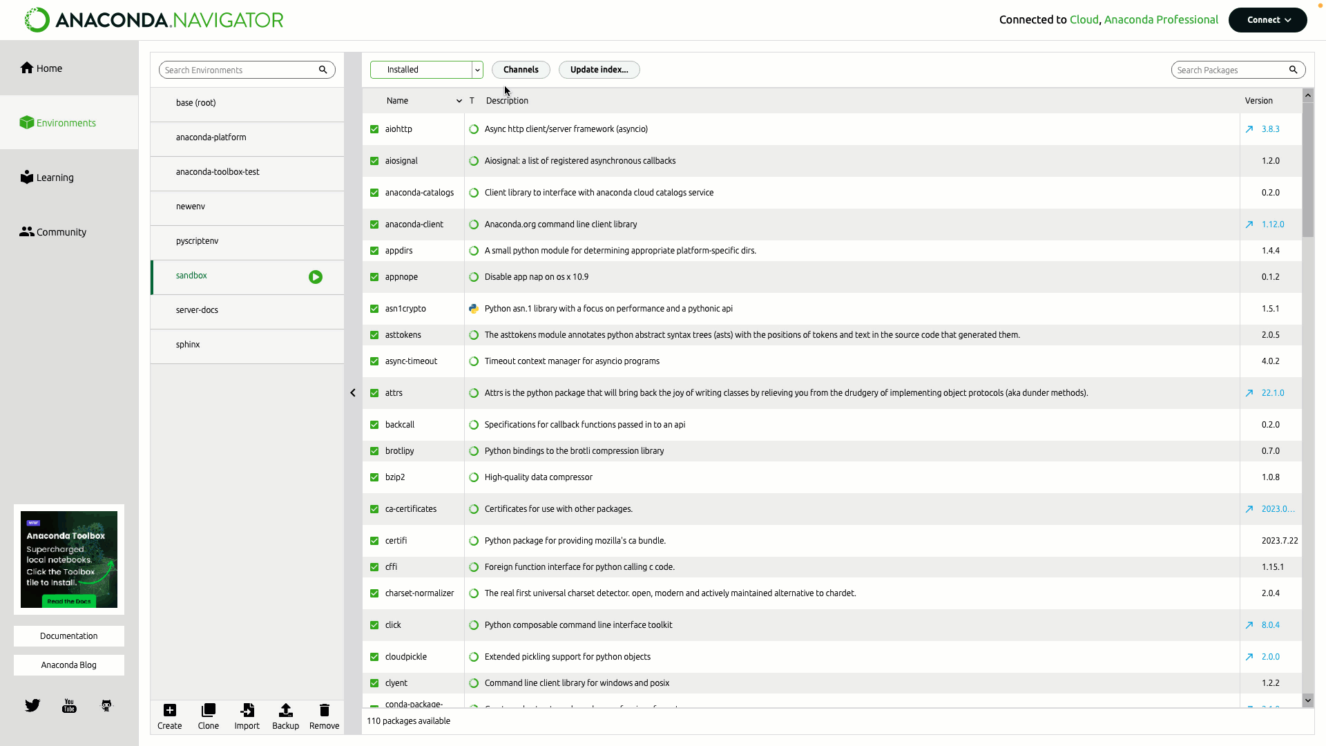 By default, only installed packages are shown in the packages table. To filter the table to show different packages:- Click the dropdown beside Channels.
