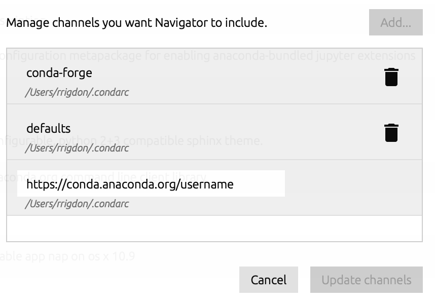 https://conda.anaconda.org/{CHANNEL}, replacing{CHANNEL}with your Anaconda.org username. -