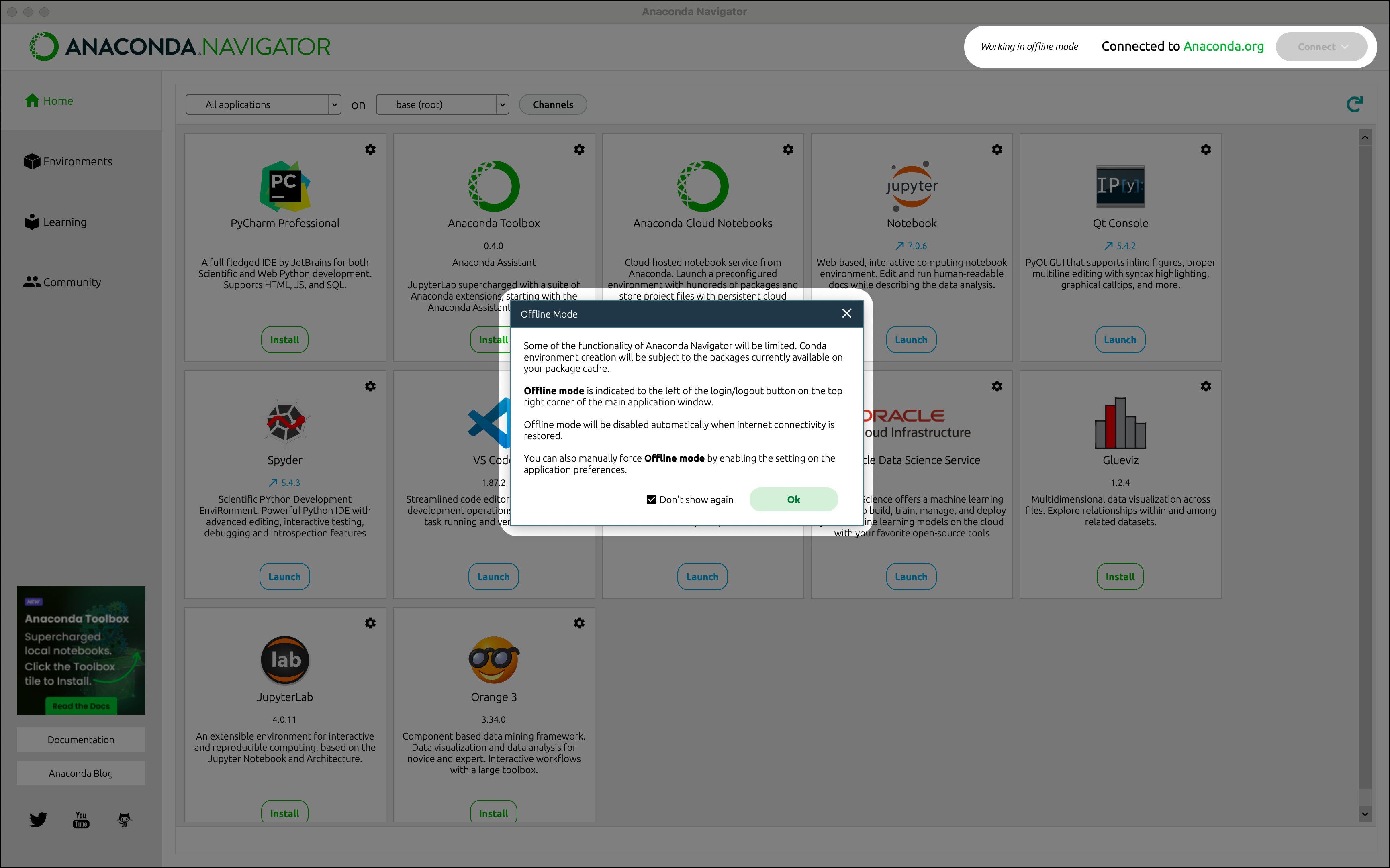 Navigator is typically used in so that it can download and install packages. If Navigator detects that internet access is not available, it automatically enables offline mode and displays this message:Documentation Index