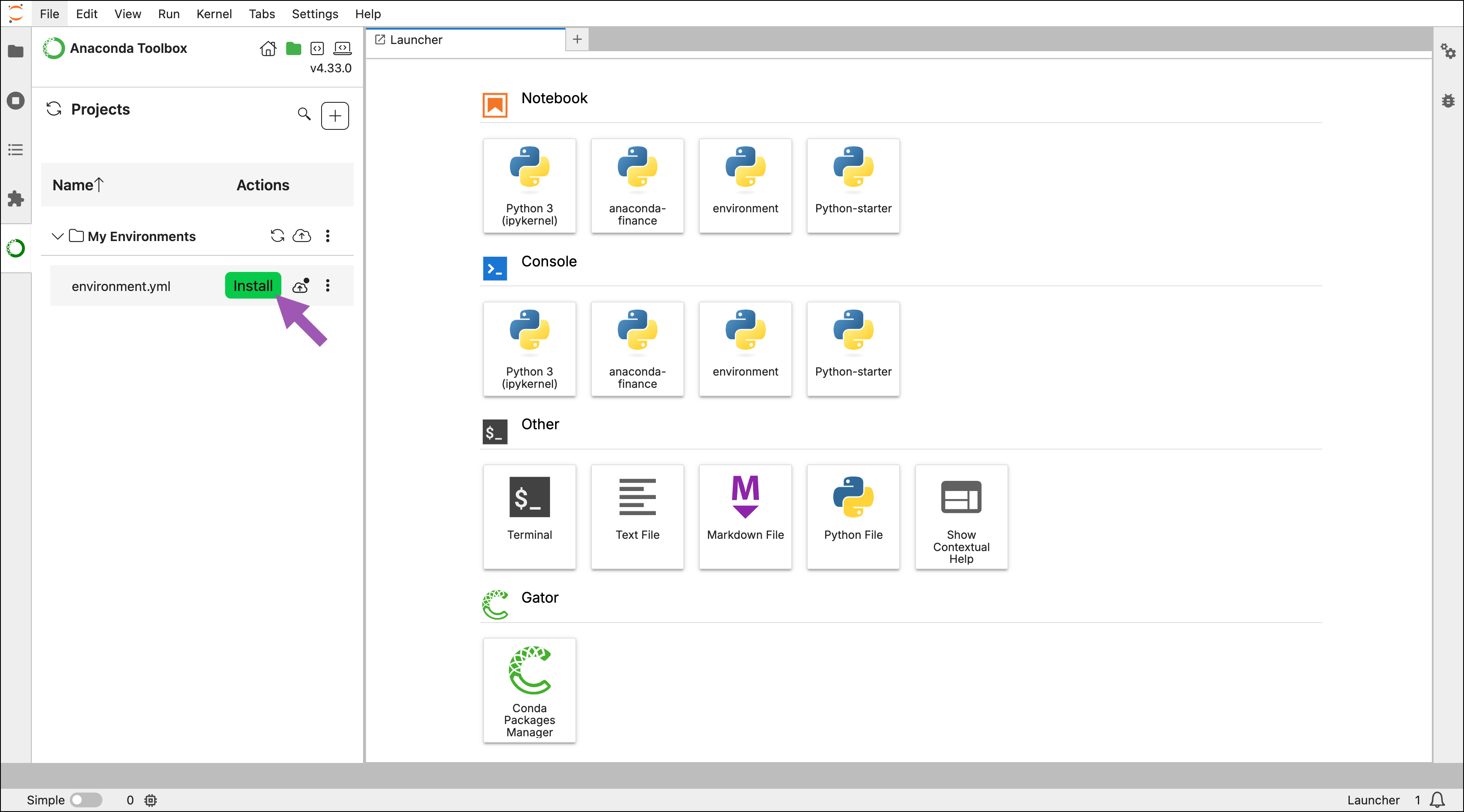 - Launch Anaconda Notebooks and select the left-side Anaconda Toolbox icon.
