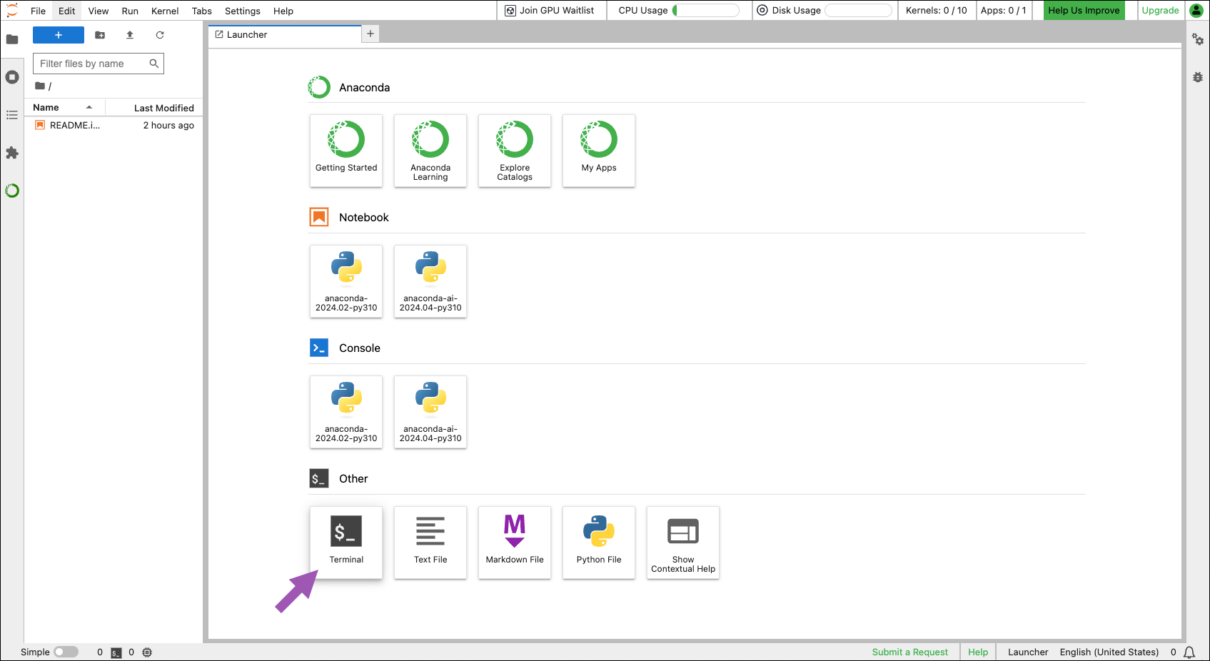 | anaconda-01-nvidia-a10 | Live | Latest Anaconda, AI, + NVIDIA Packages (see GPU Runtimes) |