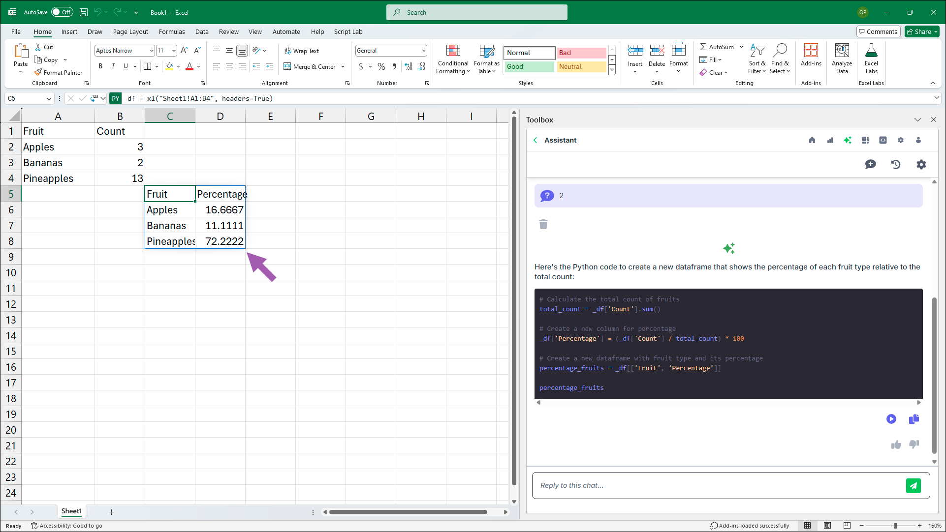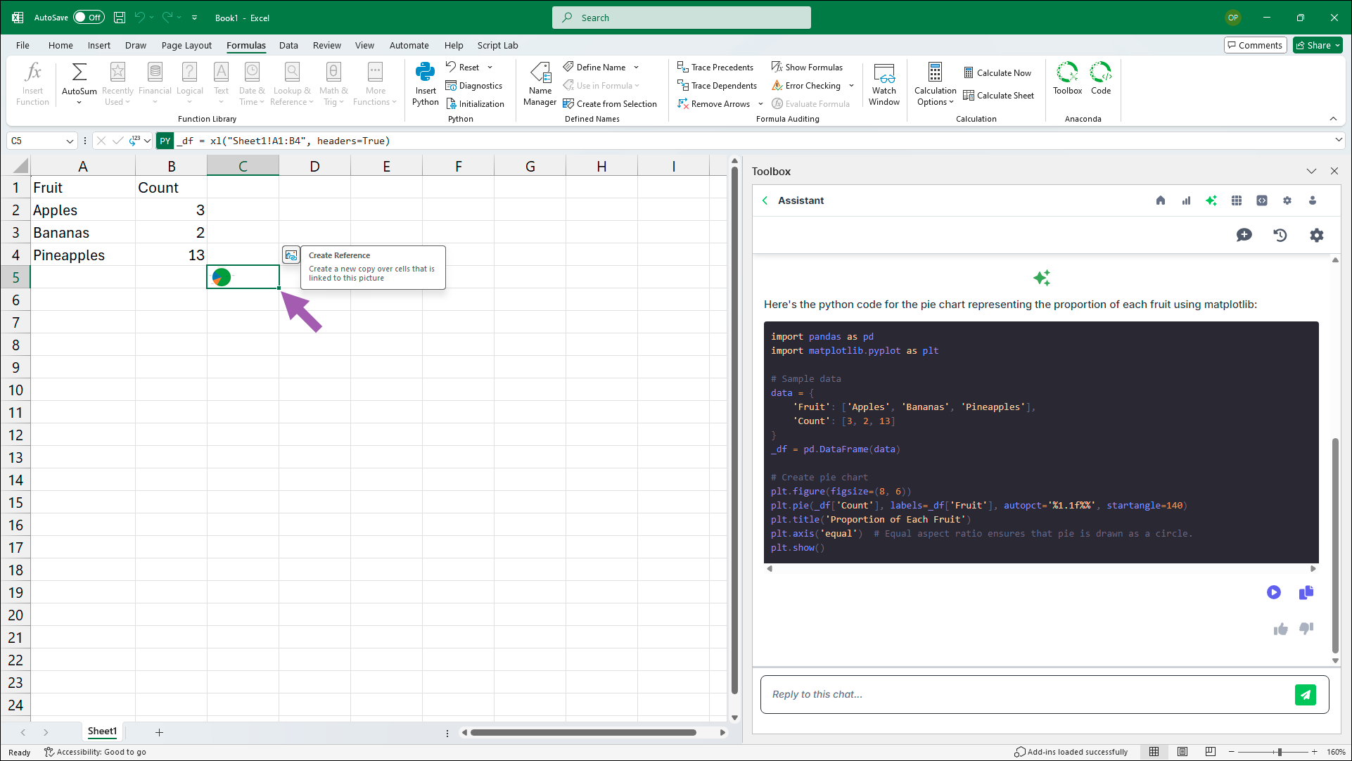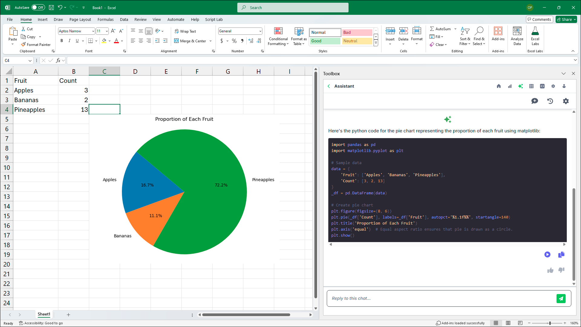 Use the Assistant to create Python code for rendering charts.- Under Work with Tables and Ranges, click Generate a chart from a table or range.
