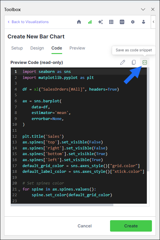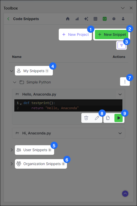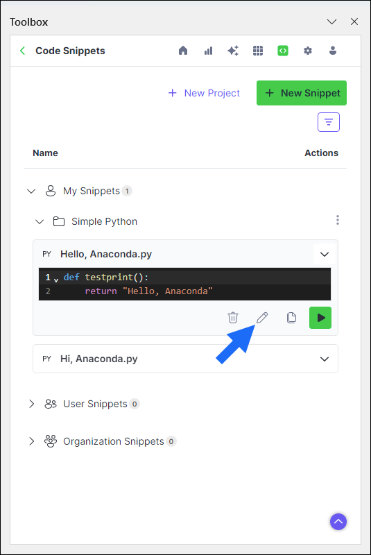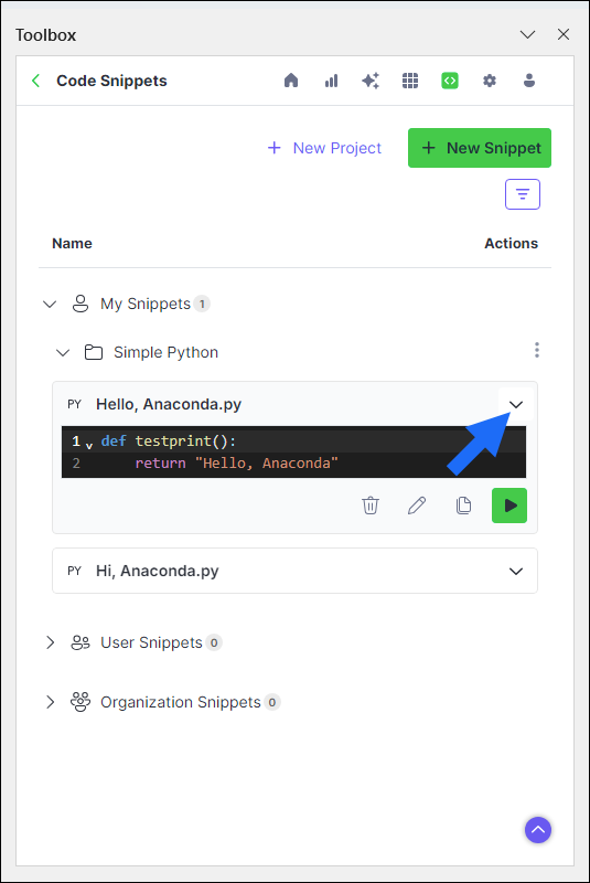 Changes made to a saved snippet in a workbook will not automatically update that snippet in Anaconda’s cloud storage. Instead, you must make changes to the snippet directly within the Anaconda Toolbox extension.- Expand the dropdown beside your snippet. A preview of your snippet appears.